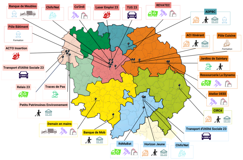 Le Réseau est ouvert à toutes les SIAE de la Creuse et regroupe aujourd’hui 22 structures d'insertion (une association intermédiaire, une entreprise d’insertion, une entreprise de travail temporaire d’insertion et 19 chantiers d’insertion).